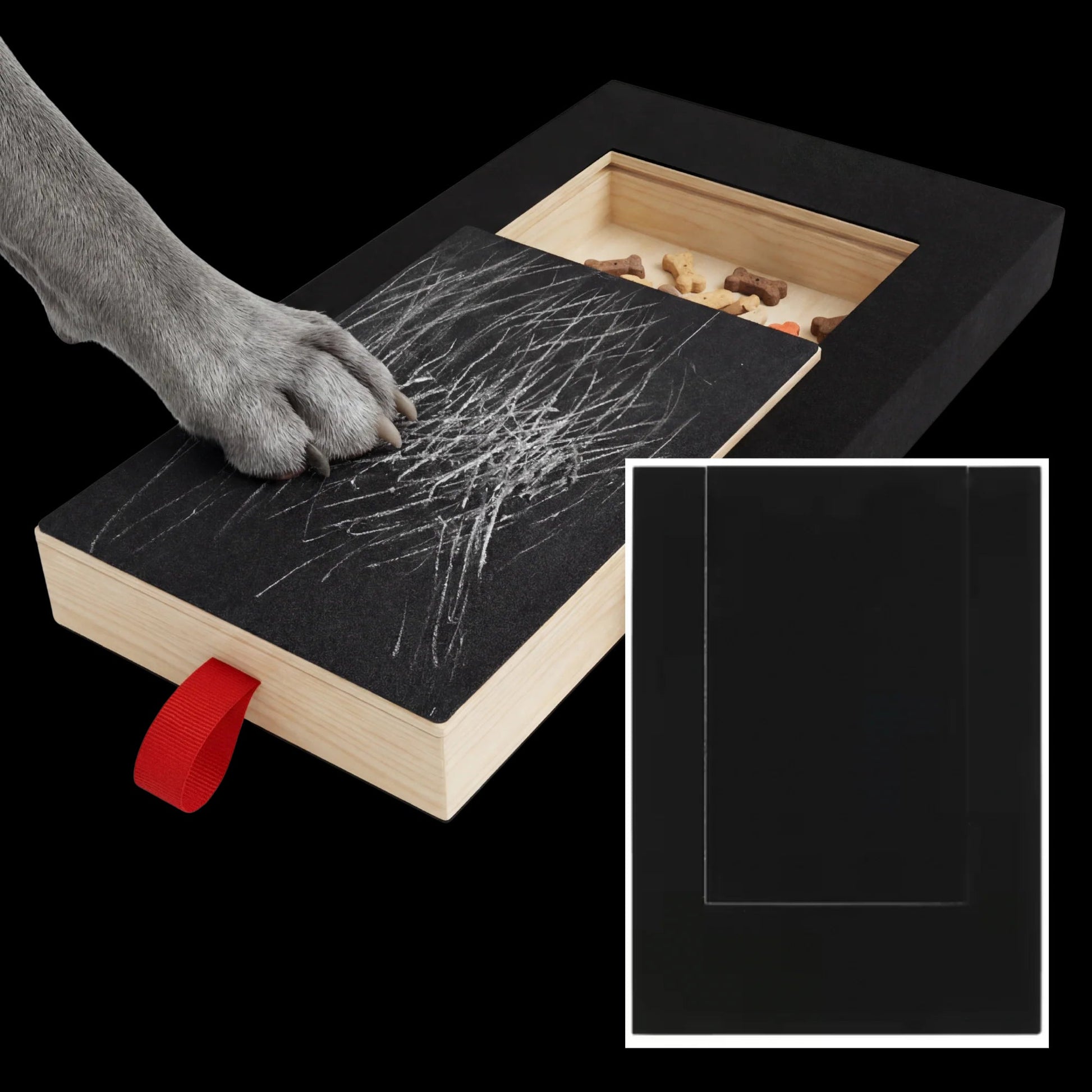 Den är utformad för ALLA raser, åldrar och storlekar! Lägg bara i en godbit och stäng skjutdörren, så kommer din valp att börja skrapa på den slipande ytan och fila ner sina klor på ett naturligt sätt.